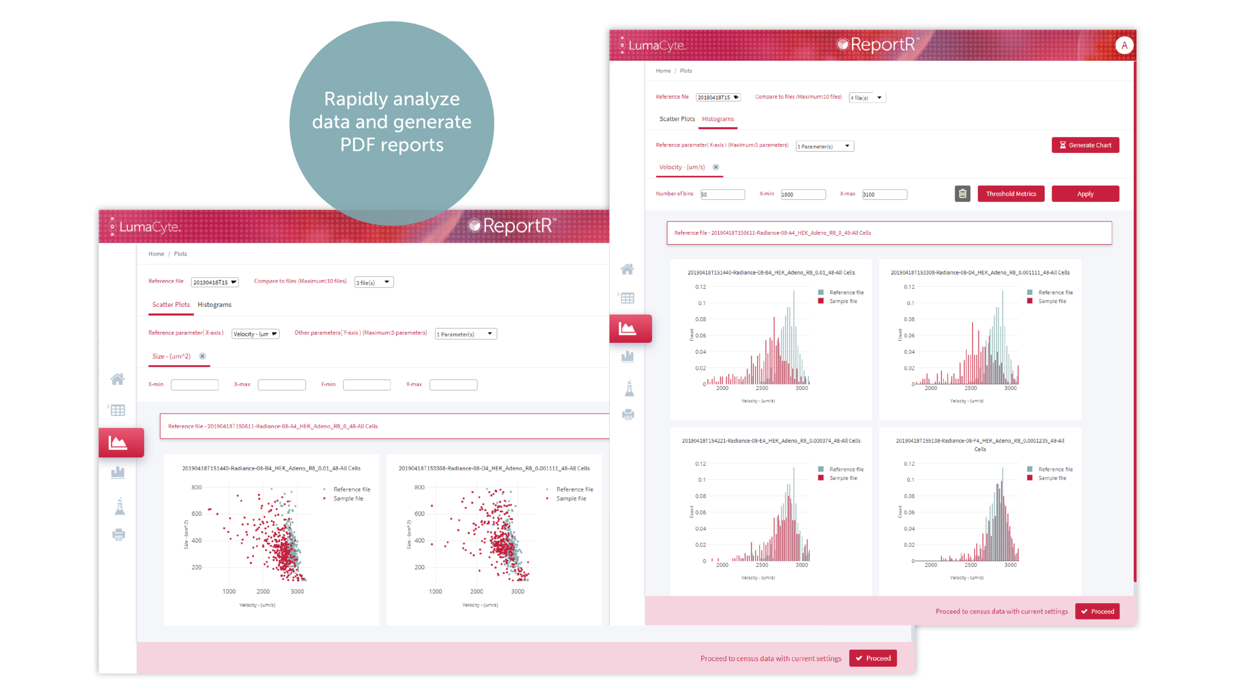 ReportR’s integration with LumaCyte’s Sampler software allows experimental details to be entered only once and then seamlessly carried through data acquisition, analysis, and reporting, maximizing efficiency and ensuring experimental consistency. LumaCyte’s end-to-end ReportR cell analysis software provides research teams the ability to analyze multiple experiments at once and rapidly visualize data all within minutes of experimental completion.