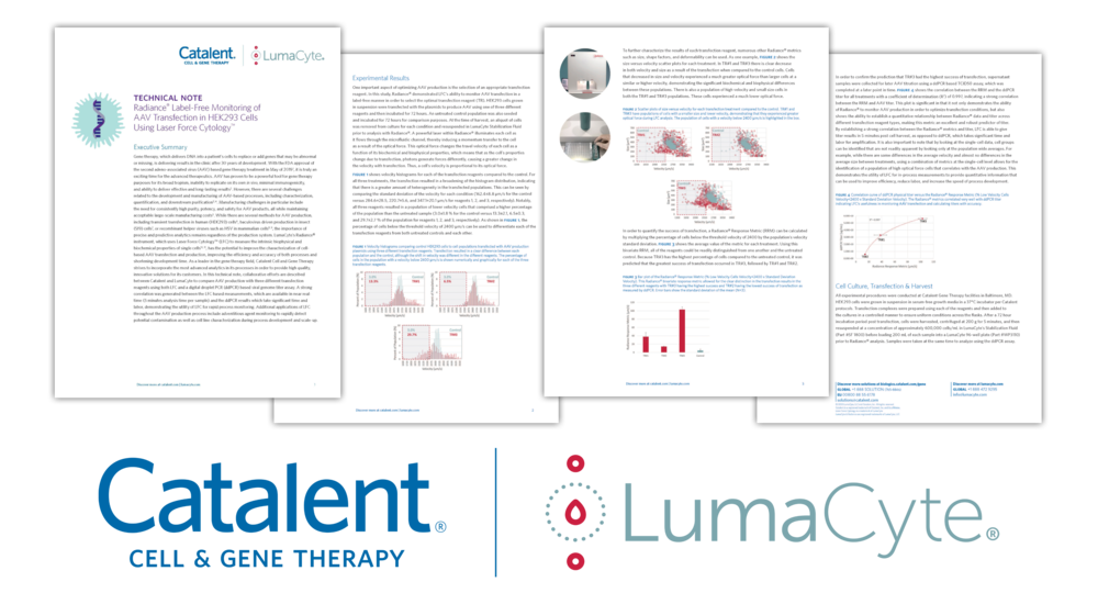 Manufacturing challenges in particular include the need for the consistent production of high purity, high potency, and robust safety for AAV products, all while maintaining acceptable large-scale manufacturing costs5.  While there are several methods for AAV production, including transient transfection in human (HEK293) cells6, baculovirus driven production in insect (Sf9) cells7, or recombinant helper viruses such as HSV in mammalian cells8, 9, the importance of precise and predictive analytics remains regardless of the production system.  LumaCyte’s Radiance® instrument, which uses Laser Force CytologyTM (LFC) to measure the intrinsic biophysical and biochemical properties of single cells10, 11, has the potential to significantly improve the characterization of cell-based AAV transfection and production, improving the efficiency and accuracy of both processes and shortening development time